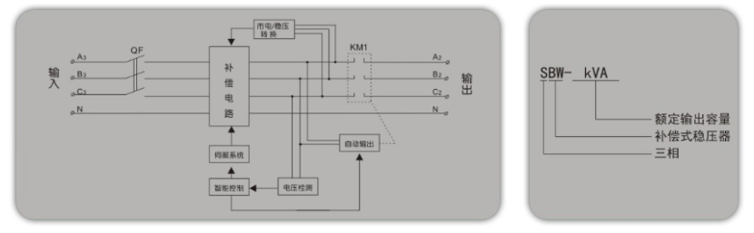 工作原理圖: 產(chǎn)品概述: 英施丹三相全自動(dòng)補(bǔ)償式電力升壓穩(wěn)壓器是適用于當(dāng)外界的供電網(wǎng)絡(luò)電壓波動(dòng)或負(fù)載變化而造成電壓波動(dòng)時(shí),能自動(dòng)保持輸出電壓穩(wěn)定。本系列產(chǎn)品與其它型式的穩(wěn)壓器相比,具有容量大、效率高、無(wú)波形畸變、電壓調(diào)節(jié)平穩(wěn)等優(yōu)點(diǎn),適用負(fù)載廣泛,能承受瞬時(shí)超載,可長(zhǎng)期連續(xù)工作,手動(dòng)/自動(dòng)切換,設(shè)有過壓保護(hù)、缺相、相序保護(hù)及機(jī)械故障自動(dòng)保護(hù),本機(jī)體積小,重量輕,使用安裝方便,運(yùn)行可靠等優(yōu)點(diǎn)。(分?jǐn)?shù)顯、儀表指示兩類) 廣泛運(yùn)用于隧道遠(yuǎn)距離升壓、礦洞升壓、工礦企業(yè)、印刷、機(jī)床、郵電、鐵路、建筑工地、學(xué)校、醫(yī)院、賓館、國(guó)防、科研等部門的電子計(jì)算機(jī)、精密機(jī)床、精密儀器、實(shí)驗(yàn)裝置、電梯及生產(chǎn)流水線的電源穩(wěn)壓中。同時(shí)也適用于電源電壓低、波動(dòng)幅度大的低壓配電終端用戶及負(fù)載變動(dòng)較大的用電設(shè)備,如升降機(jī)、起重機(jī)、攪拌機(jī)等一切需要電壓穩(wěn)定的場(chǎng)所。技術(shù)參數(shù): 輸入電壓 | 單相220V±20%,三相四線線電壓380V±20%(可定制±30% ) | 輸出電壓 | 單相220V 三相380V | 輸出精度 | ±1-5﹪(可調(diào)) | 頻率 | 50Hz/60Hz | 效率 | ≥98﹪(功率等級(jí)50KVA以上) | 響應(yīng)速度 | ≤1.5S | 環(huán)境溫度 | -10℃- + 40℃ | 絕緣電阻 | ≥ 2MΩ | 過載能力 | 二倍額定電流,維持一分鐘 | 波形失真 | 無(wú)附加波形失真 | 保護(hù)功能 | 過壓、欠壓、過流、缺相、相序、旁路 | 旁路 | 當(dāng)穩(wěn)壓器需要維護(hù)或穩(wěn)壓器出現(xiàn)故障時(shí)可手動(dòng)切入市電 | 適應(yīng)負(fù)載 | 阻性 容性 感性 | 控制系統(tǒng) | 機(jī)采用雙控制器系統(tǒng)控制,實(shí)現(xiàn)人性化設(shè)計(jì),能有效的減少對(duì)設(shè) 備的維護(hù)時(shí)間,可選擇人機(jī)界面 |
