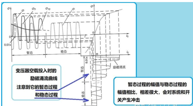 圖1:變壓器的勵磁涌流 變壓器的勵磁涌流比變壓器正常運行電流大很多倍,且存在過渡時間。如果開關選配的不合適,當然在開機送電一刻開關就跳閘了。