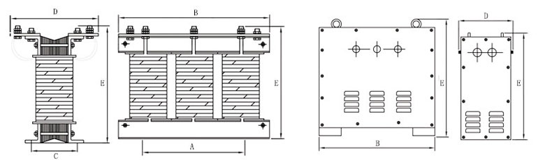 二、690V660V型號(hào)及其含義 三、690V660V外型及安裝尺寸 | 型號(hào) | 外形尺寸(開(kāi)啟式) | 安裝孔距 | 外形尺寸(防護(hù)式) | | B × D × E | A × C | B × D × E | | SG/SBK-1KVA | 200×150×210 | 180×120 | 310×280×300 | | SG/SBK-1.5KVA | 240×150×230 | 180×120 | 350×300×360 | | SG/SBK-2KVA | 240×160×230 | 180×150 | 350×300×360 | | SG/SBK-3KVA | 250×180×230 | 180×170 | 350×300×360 | | SG/SBK-4KVA | 300×180×280 | 220×180 | 400×350×410 | | SG/SBK-5KVA | 300×200×280 | 220×200 | 400×350×410 | | SG/SBK-7KVA | 380×200×350 | 280×180 | 500×400×480 | | SG/SBK-8KVA | 380×220×350 | 280×190 | 500×400×480 | | SG/SBK-10KVA | 380×240×350 | 280×220 | 500×400×480 | | SG/SBK-15KVA | 420×220×400 | 280×220 | 600×500×580 | | SG/SBK-20KVA | 420×240×410 | 280×260 | 600×500×580 | | SG/SBK-30KVA | 480×260×460 | 320×260 | 600×500×580 | | SG/SBK-40KVA | 530×320×500 | 320×280 | 750×600×720 | | SG/SBK-50KVA | 530×350×520 | 450×260 | 750×600×720 | | SG/SBK-80KVA | 630×400×580 | 450×280 | 850×650×820 | | SG/SBK-100KVA | 720×500×650 | 550×350 | 950×700×850 | | SG/SBK-200KVA | 850×550×700 | 600×400 | 1100×800×1000 | SG/SBK-300KVA 400kva500kva600kva800kva1000kva 2000kva300kva